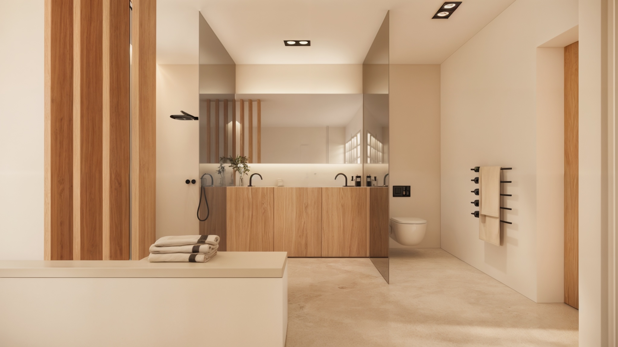 Die Gestaltung verbindet Alltagstauglichkeit mit Komfort. Eine zentrale Kücheninsel mit Frühstücksbar bietet kommunikative Momente, während flexible Sitzbereiche und offene Schranksysteme Leichtigkeit erzeugen. Schlaf- und Badezimmer verschmelzen visuell zu einer Einheit, die Intimität wahrt und gleichzeitig Großzügigkeit vermittelt.