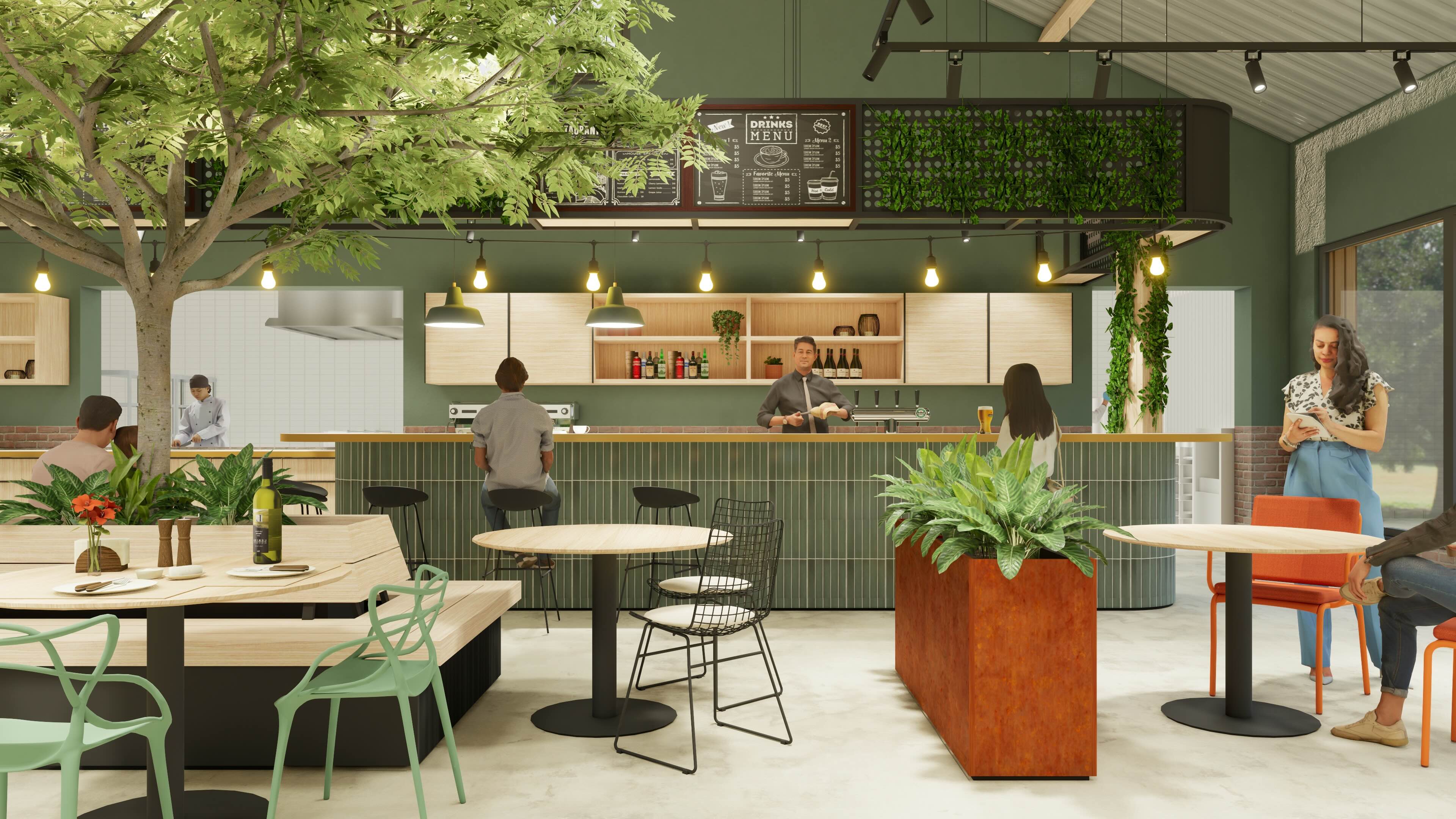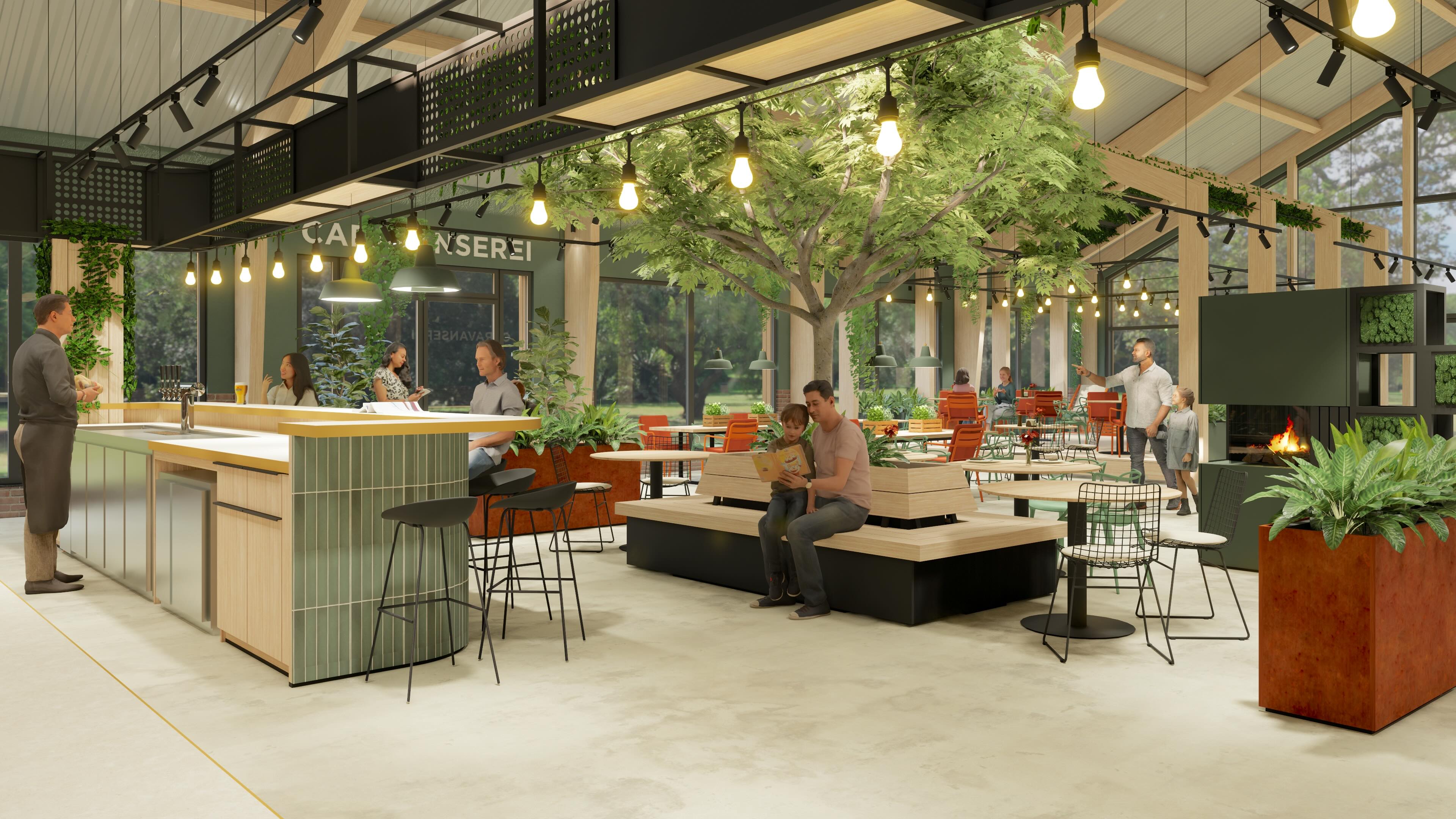 Anstelle starrer Raumteiler sorgt eine offene Architektur für fließende Übergänge. Möblierung und Bepflanzung strukturieren den Gastraum auf subtile Weise. Ein zentraler „grüner“ Mittelpunkt sowie modulare Pflanzinseln dienen als Orientierungspunkte und schaffen Sichtachsen, die Großzügigkeit und Transparenz vermitteln. Das Ergebnis ist ein Konzept, das Funktionalität mit Atmosphäre verbindet.