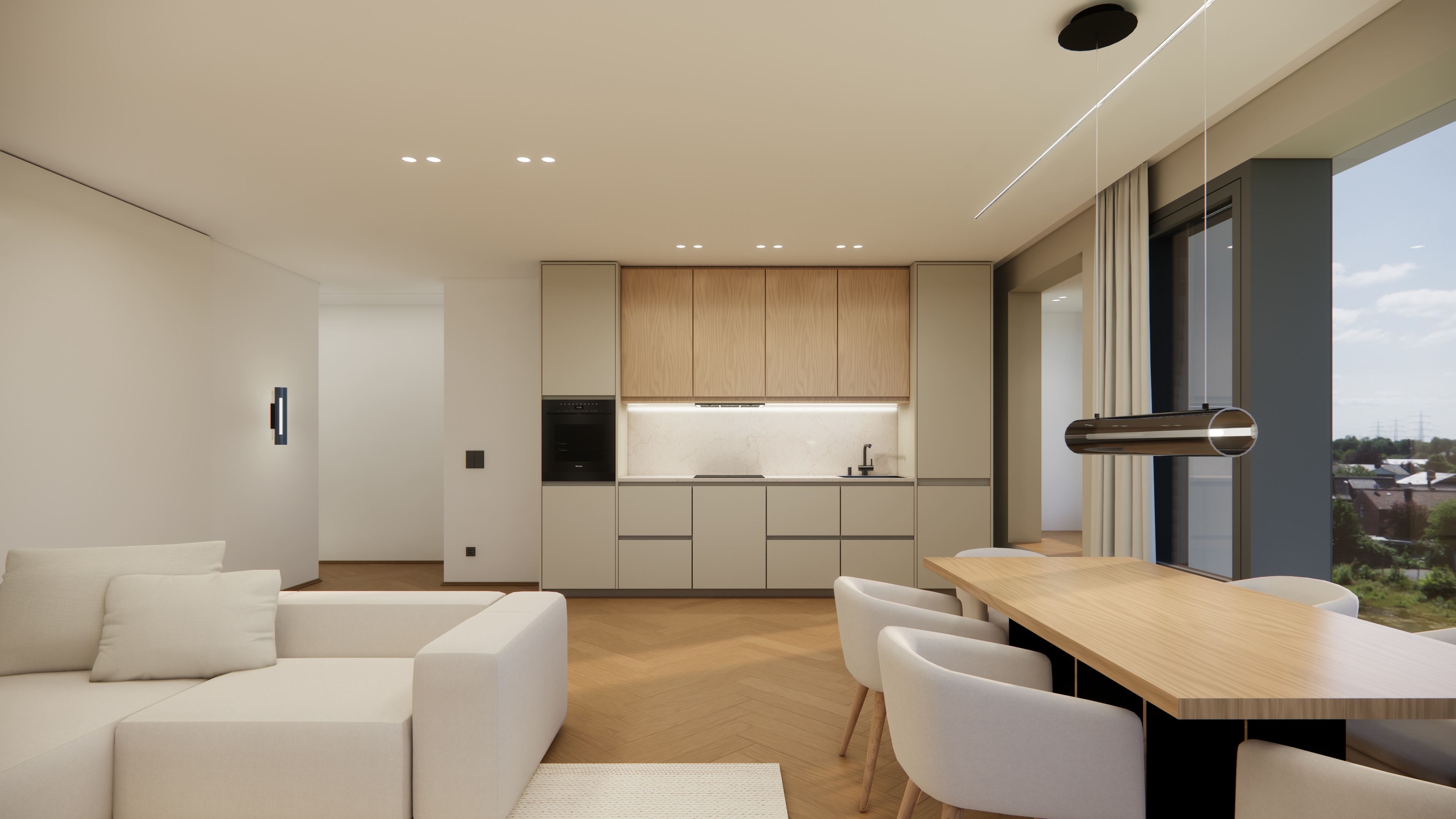 Das Lichtdesign der Wohnung verbindet Funktionalität mit Stimmung. Indirekte Beleuchtung sorgt abends für eine weiche Atmosphäre, während mehrflammige Spots eine gleichmäßige Allgemeinbeleuchtung schaffen. Eine Pendelleuchte über dem Esstisch setzt einen gestalterischen Akzent und betont den kommunikativen Mittelpunkt. Eingebaute Beleuchtung in Küche und Einbauschränken sorgt für zusätzliche Funktionalität und stimmungsvolle Akzente. Große Fenster verstärken tagsüber die natürliche Helligkeit und unterstützen die offene, helle Raumwirkung.